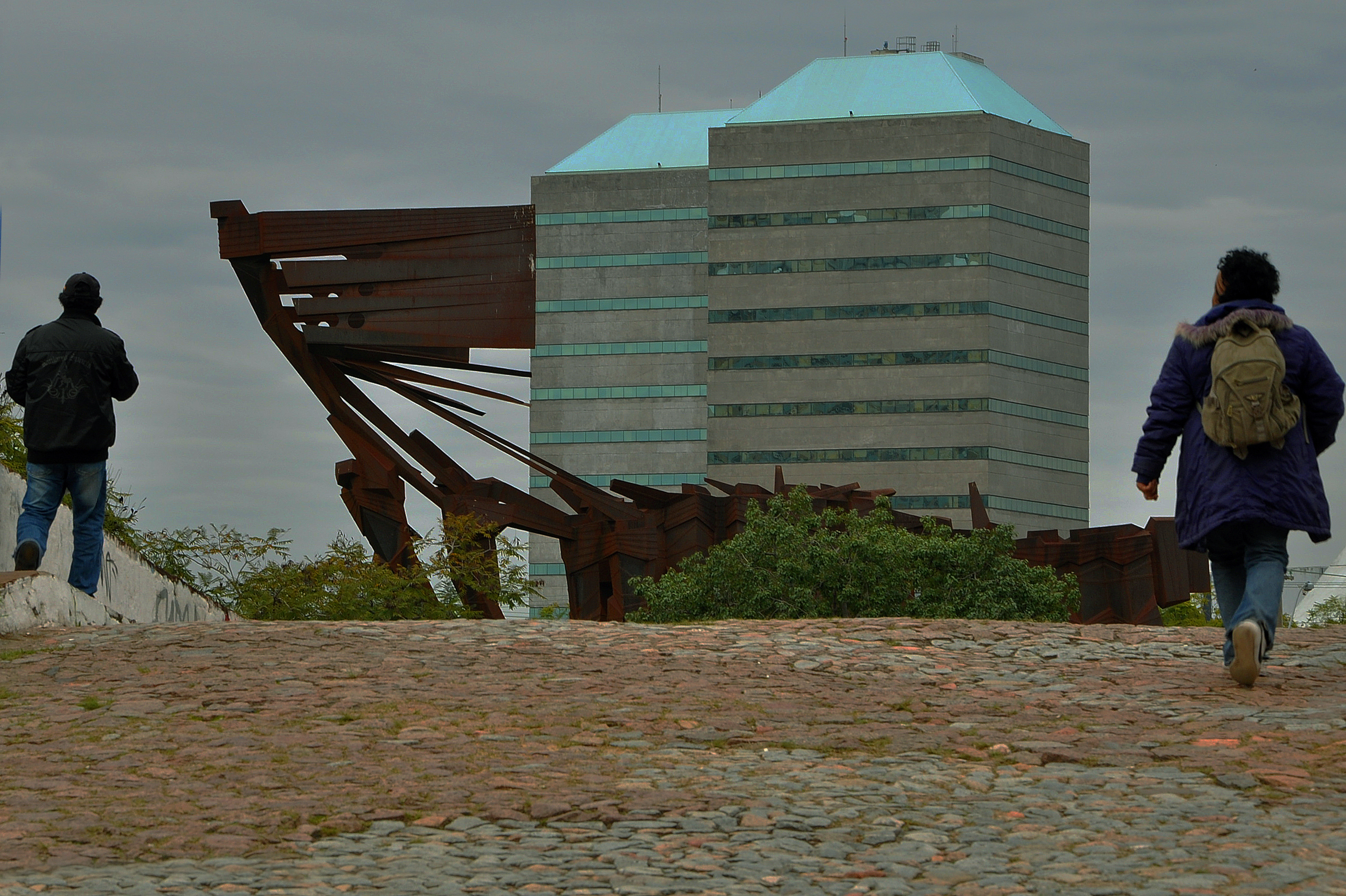 A imagem representa o cidadão e o Ministério Público. Na foto estão duas pessoas caminhando em direção à sede institucional do Ministério Público do Rio Grande do Sul, em Porto Alegre. Caminham sobre a Ponte de Pedra, monumento histórico da cidade, inaugurado em 1854, localizada no Largo dos Açorianos, onde também fica localizado o Monumento aos Açorianos, construído em homenagem à chegada dos primeiros casais açorianos que povoaram a cidade em 1752