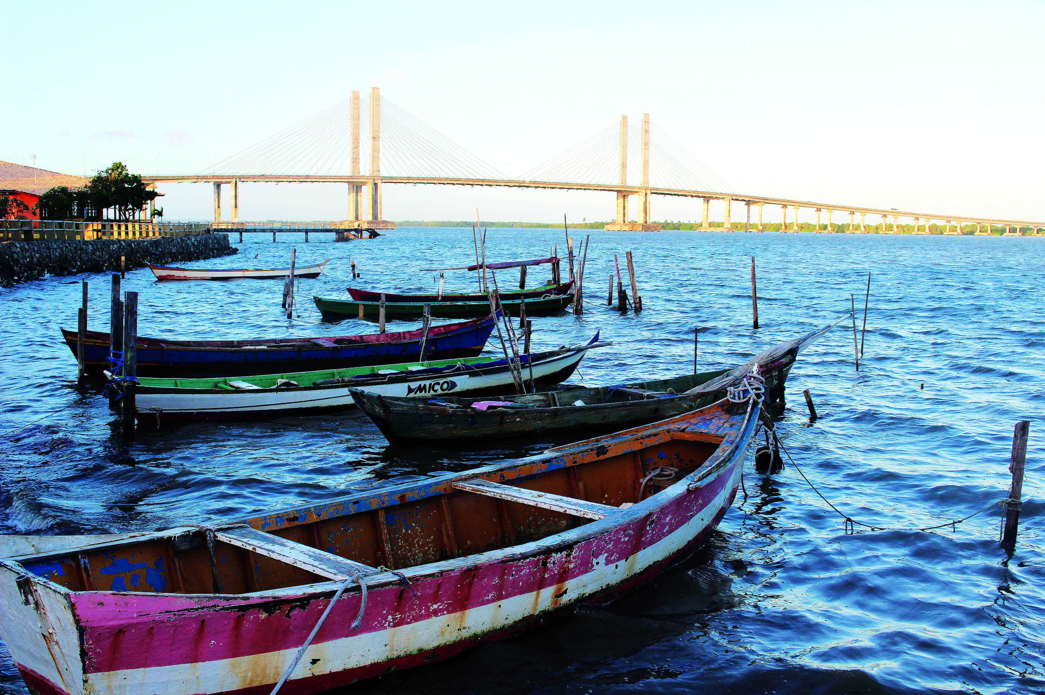 Pequenos barcos de pesca ancorados no Rio Sergipe, em Aracaju. Mostram a Resistência da cultura local através do trabalho artesanal dos pequenos pescadores. A ponte Aracaju-Barra representa um antigo sonho de integração entre a capital e a "Ilha de Santa Luzia", concretizado nos idos de 2006.