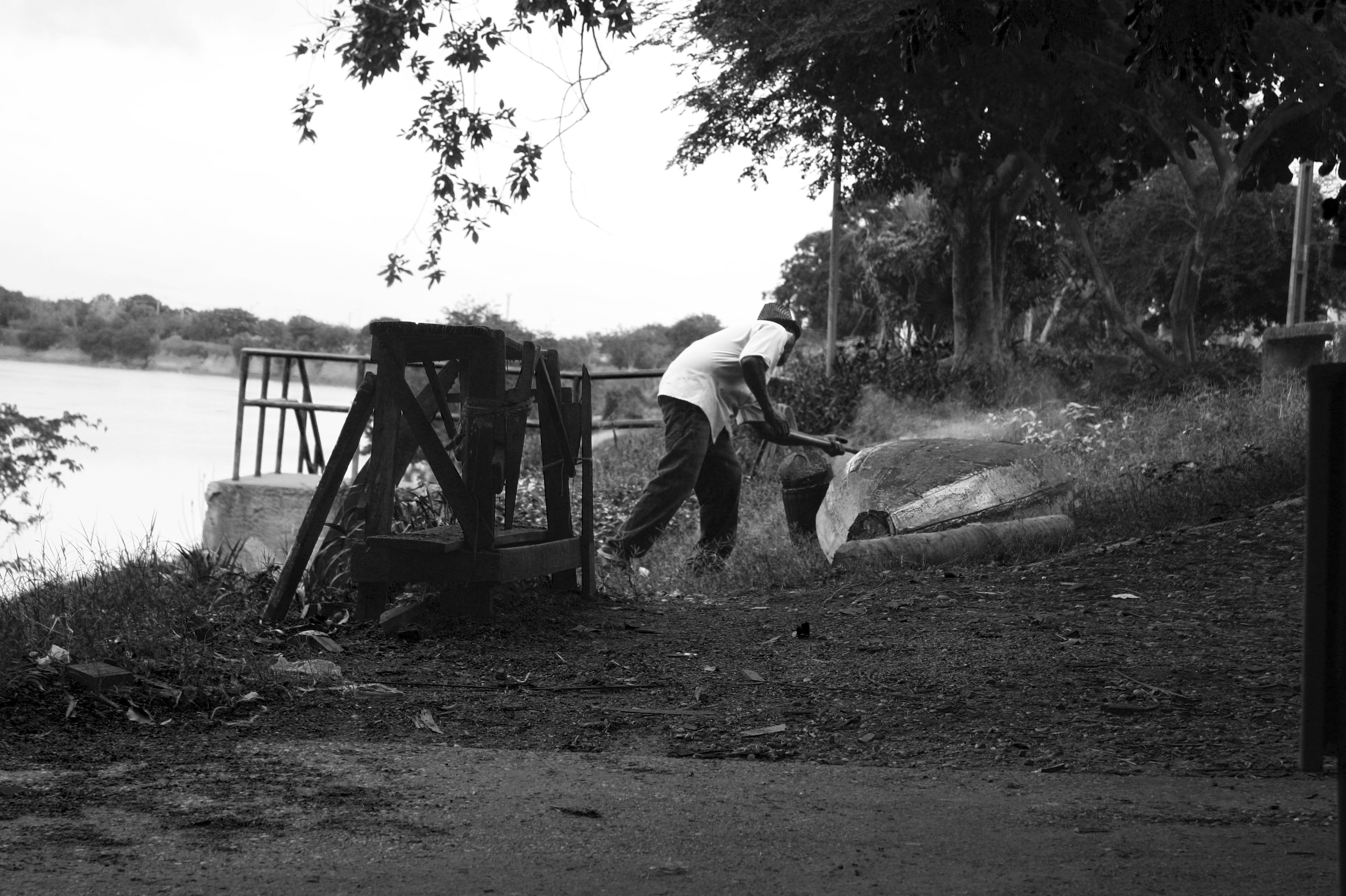 À beira do rio Poty e embaixo de uma ponte localizado na zona Norte de Teresina (PI), um senhor, por volta dos 60 anos, realiza o processo de calafetar o seu barco de pesca. Ele aplica piche para melhorar o transporte e remover rachaduras e furos. A atividade de pescador ainda prepondera como maneira de garantir renda e comida para casa. O trabalho de calafetar é habitual entre pescadores e pode levar horas para ser finalizado, além de expor à temperatura elevada do produto.