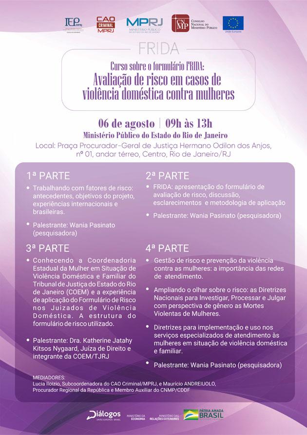 Foram abertas as inscrições para o “Curso sobre o formulário FRIDA: avaliação de risco em casos de violência doméstica contra mulheres”. A capacitação, que será realizada dia 6 de agosto, no Edifício das Procuradorias do Ministério Público do Estado do Rio de Janeiro (MP/RJ), é uma iniciativa do Conselho Nacional do Ministério Público (CNMP), por meio da Comissão de Defesa dos Direitos Fundamentais (CDDF), que é presidida pelo conselheiro Valter Shuenquener, e da Delegação da União Europeia no Brasil (Delbra), em parceria com o MP/RJ.