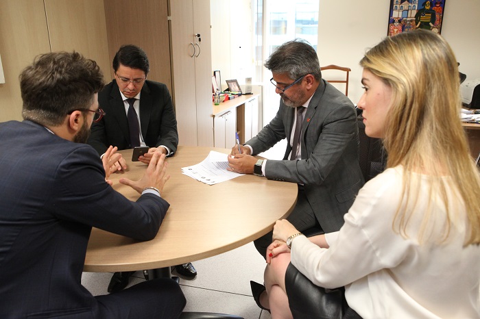 O conselheiro Lauro Machado Nogueira, no edifício-sede do Conselho Nacional do Ministério Público (CNMP), em Brasília-DF, assinou o acordo citado na presença do representante das duas instituições italianas, Federico Penna. O documento já havia sido firmado pelo diretor da CSGLA, Riccardo Cardilli, e pela diretora da Accademia Juris Roma, Luciana Maria Tavares Rodrigues.