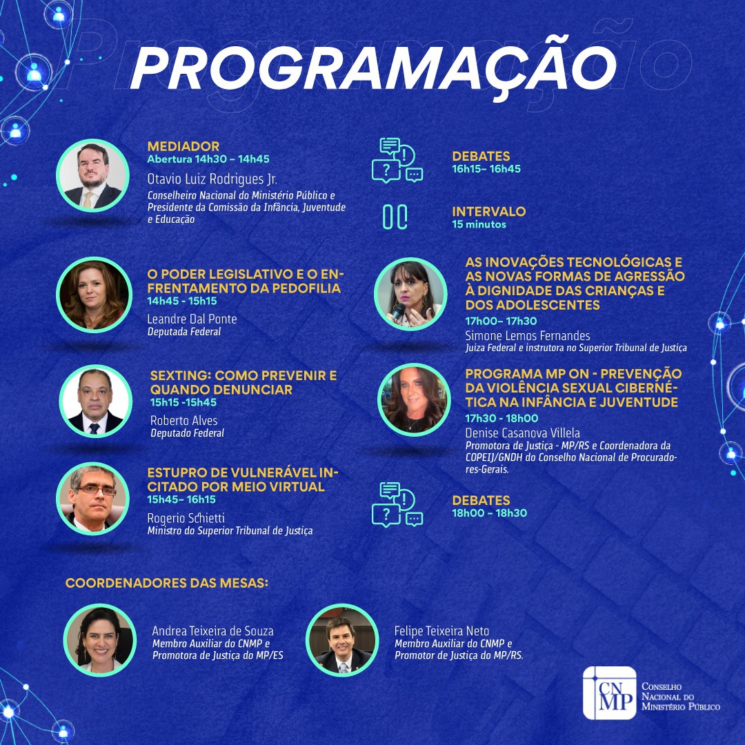 Representantes do Ministério Público, Câmara dos Deputados e do Judiciário são os convidados para o evento virtual “Redes Sociais e Pedofilia: diagnósticos e soluções”, realizado pela Comissão da Infância, Juventude e Educação do Conselho Nacional do Ministério Público (CNMP).